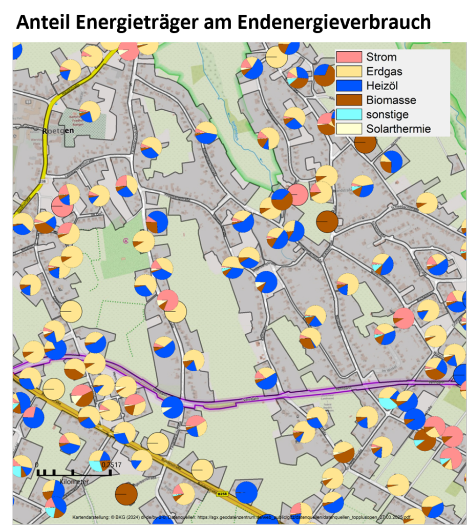- Erhebung des aktuellen Wärmeverbrauchs und -bedarfs in der Kommune, inklusive Berechnung der Treibhausgasemissionen sowie Analyse der Gebiets-, Versorgungs- und Beheizungsstruktur.
